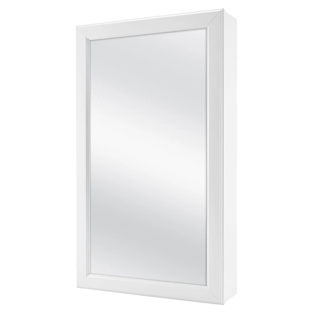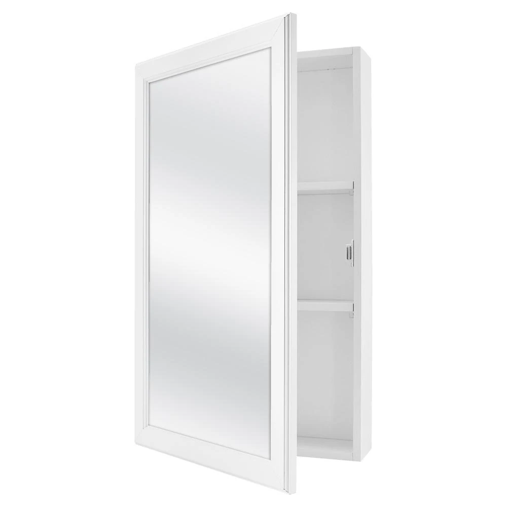 The Glacier Bay 15-1/4 in. W x 26 in. H x 4.63 in. D White Framed Surface-Mount Bathroom Medicine Cabinet is a great addition to your bathroom or powder room. The 2 adjustable shelves offers ample storage flexibility. Double shelf pegs enable you to customize your space quick and easy. The versatility of this cabinet also allows the door to be reversible to open left or right based on your preference. Wood Composite construction provides exceptional durability and strength. Fully assembled for your convenience.