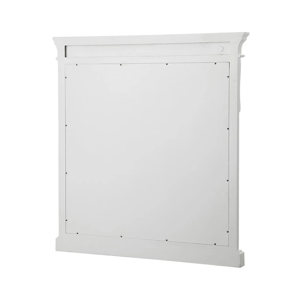 The elegant Naples 30 in. x 32 in. poplar-framed mirror has an expansive, rectangular design and sleek white finish that complements a variety of bathrooms. Subtle architectural detailing highlights the beauty. Finished in sleek white, this versatile mirror will complement a variety of bathroom styles. The rectangular mirror is designed to be hung vertically. Mounting hardware is conveniently attached.