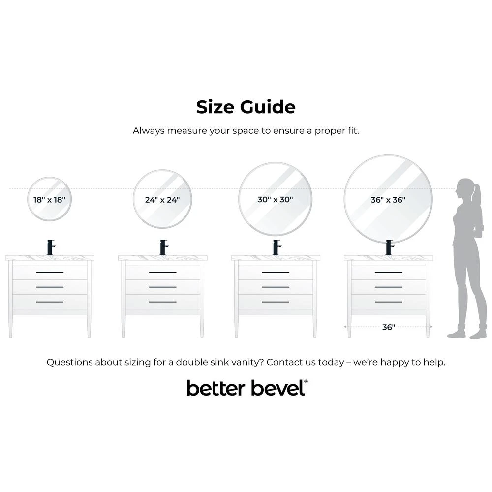 This Frameless Round Wall Mirror from better bevel is a classic, highly versatile design. Alone or in multiples, this round mirror is ideal over a bathroom vanity but can also serve as a high-quality accent piece in an entryway, bedroom or living room. This unframed mirror is available in 18 in. x 18 in., 24 in. x 24 in., 28 in. x 28 in., 30 in. x 30 in., and 36 in. x 36 in. sizes. It’s constructed of premium-quality 1/4 in. glass for the finest reflection. The mirror features a 1 in. bevel and high-polished edges. An innovative, ultra-flush mounting system allows for quick and secure installation. Drywall anchors and screws for wall mounting are included. Thoughtfully designed packaging ensures safe delivery. Proudly designed, assembled, and inspected in the USA by a 3rd-generation family-owned company.