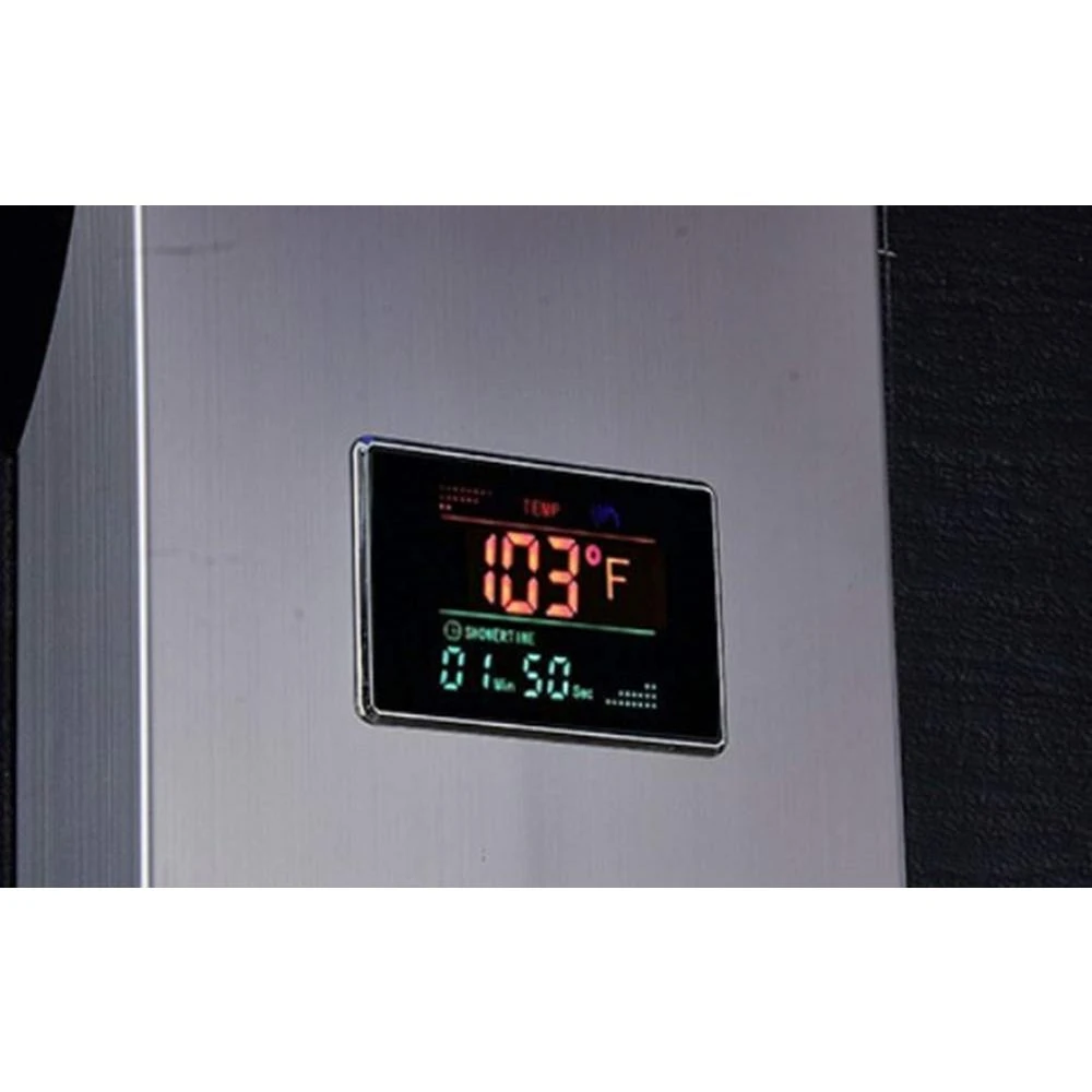 - Luxury shower panel has built-in LED temperature display, LED overhead rainfall showerhead, adjustable high-powered body massage jets, tub spout, and high-efficiency multi-function handheld shower wand
