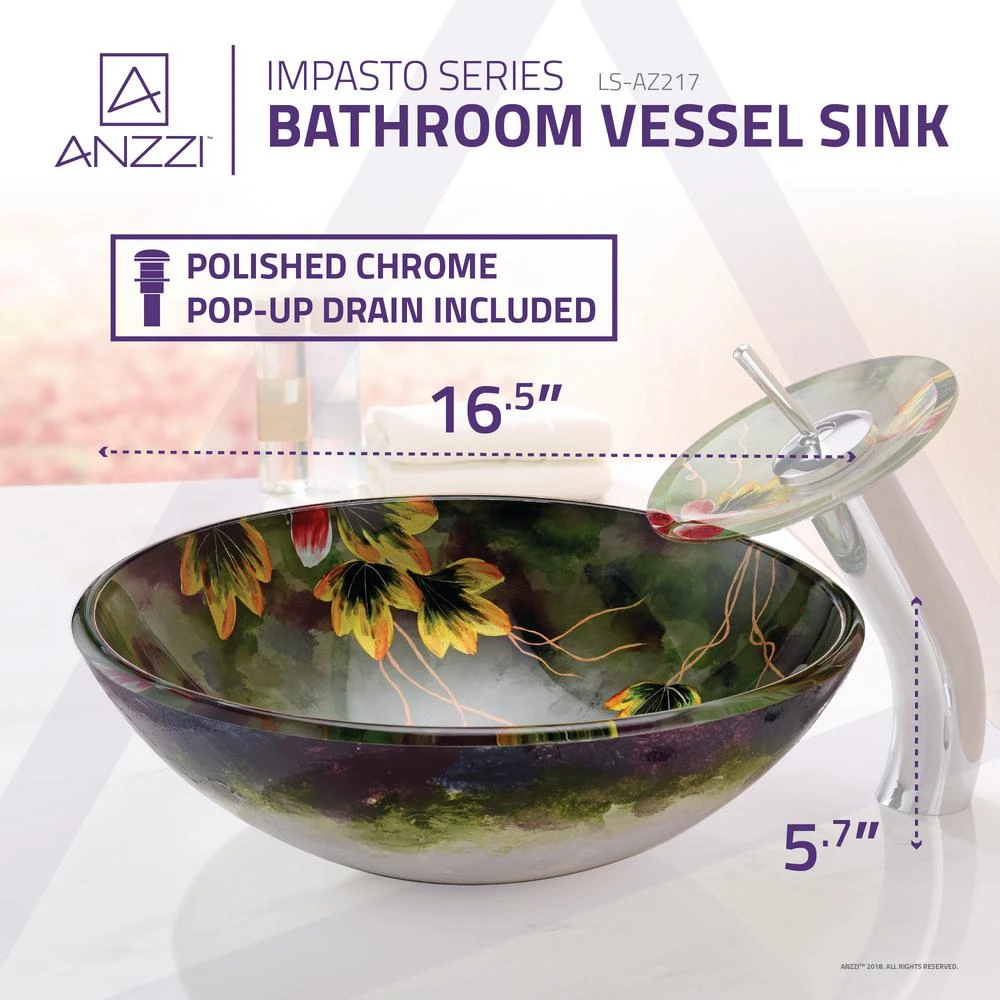 The ANZZI Impasto Series sink is a traditionally crafted round vessel sink adorned in a Hand Painted Mural finish. Each ANZZI vessel sink if formed using Rhino alloy certified high tempered Deco-Glass material. The result is an elegantly shaped and captivating vessel centerpiece for any bathroom counter.