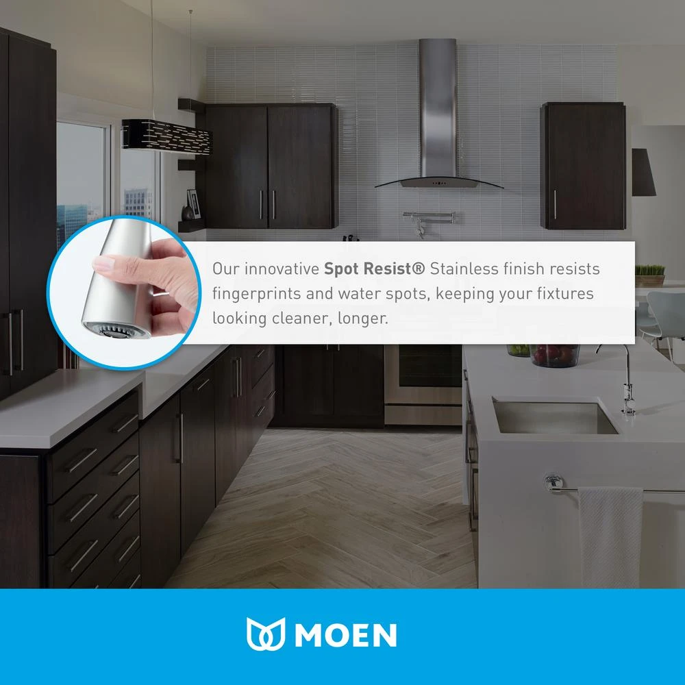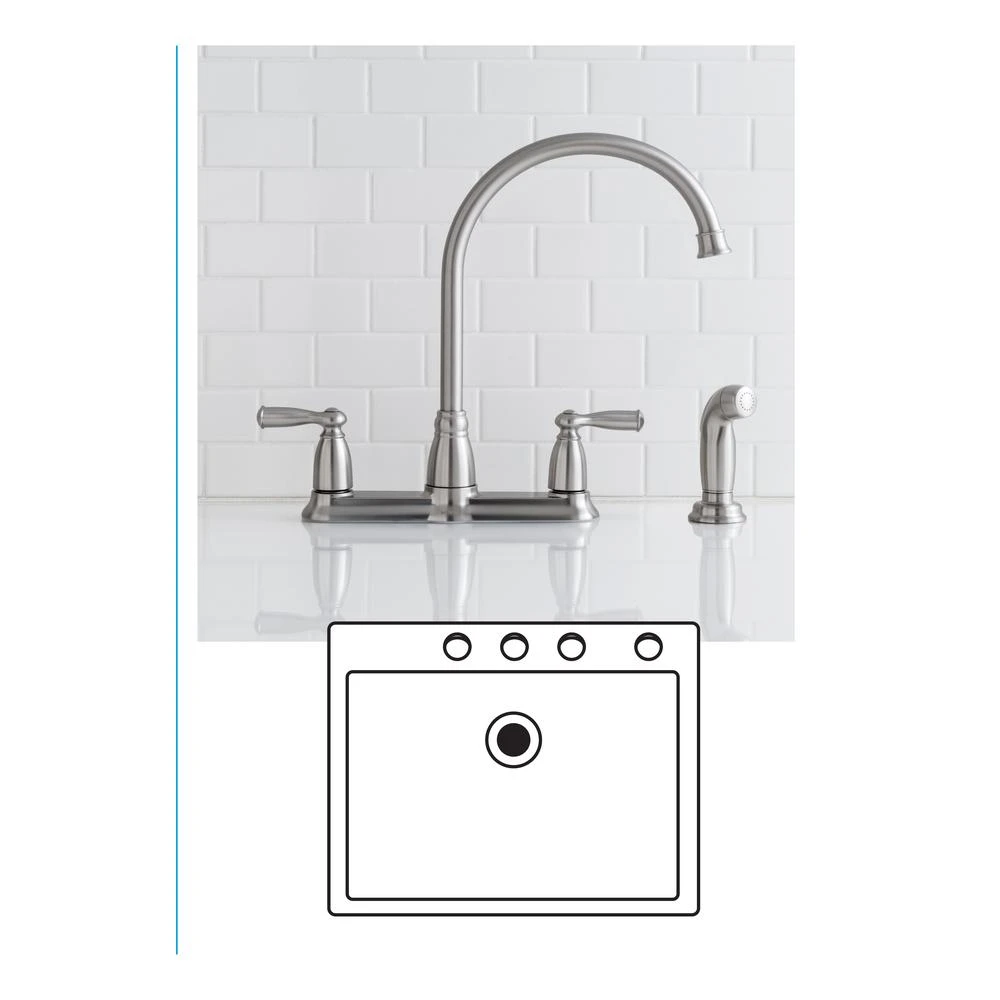The MOEN Banbury 2-Handle Kitchen Faucet is perfect for the busy kitchen with its conventional deck-mount design. Its Spot Resist finish helps repel fingerprints and water spots to maintain the brilliance of the original finish and wipe clean easily. The high-arc spout allows for greater clearance so you can wash large pots and pans. It includes a convenient side sprayer, ideal for washing large pots and pans, and rinsing the sink down afterwards.