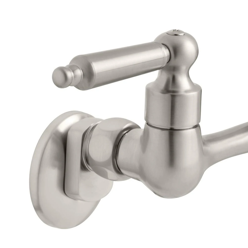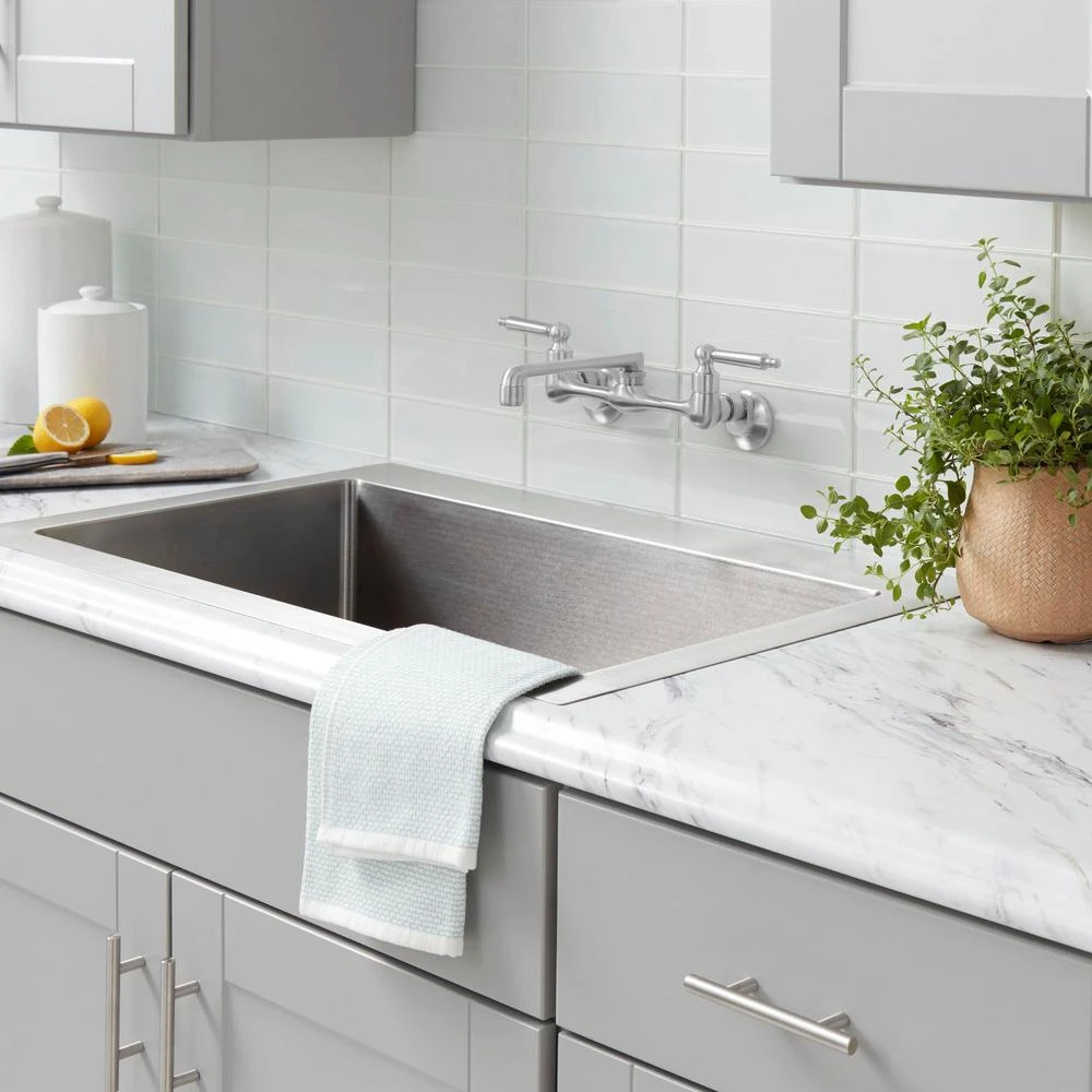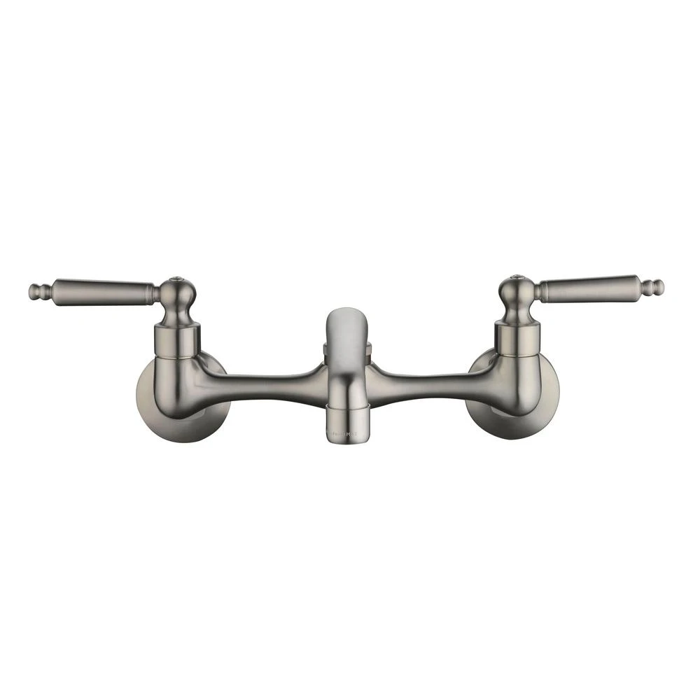 The Glacier Bay Builders 2-Handle Low-Arc Wall Mount Kitchen Faucet in Stainless Steel features a unique wall-mount design that enables you to install it regardless of your sink’s existing fixture holes. Its design also saves you counter space, while its lever handles allow for easy use. This faucet has a 7-9 in. adjustable center distance for versatile installation and hookup.