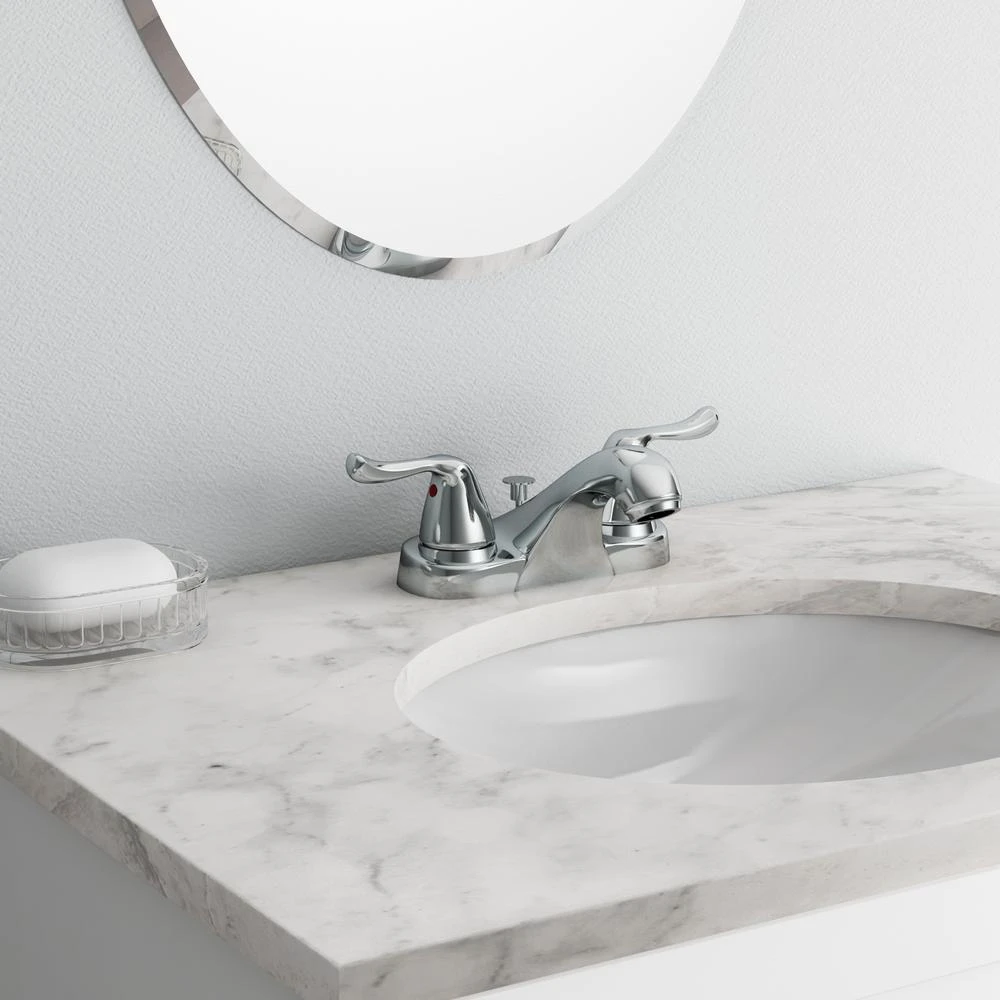 The Glacier Bay Constructor 4 in. 2-Handle Mid-Arc Lavatory Faucet with Click install Pop-Up Assembly in Chrome Finish has an elegant, curved design that will complement a wide variety of bathroom or powder room decor. WaterSense certified, this faucet has a 1.2 GPM rate to help reduce water use and washerless cartridges to prevent drips. Easy to use with easy control metal lever handles, the sleek middle-arc spout allows plenty of sink space for bath tasks. Built-to-last with a durable and easy to clean triple chrome-plated finish, a pop-up drain assembly set is included. Pair with other pieces from the Constructor Collection for a complete and polished look. Limited lifetime warranty.