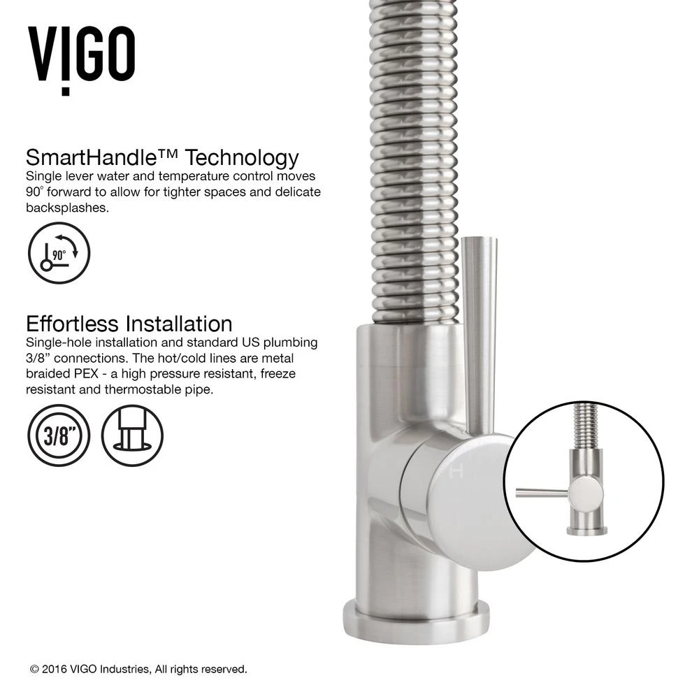 The pull-down, dual action spray head on the VIGO Edison Pull-Down Spray Kitchen Faucet allows for your choice of aerated flow or powerful spray for all your modern kitchen needs. The 360° swivel spout extends up to 30 in. for ease of use and maneuverability. With spiral details and a solid brass construction, the Edison kitchen faucet is sure to be an immediate favorite in your home.