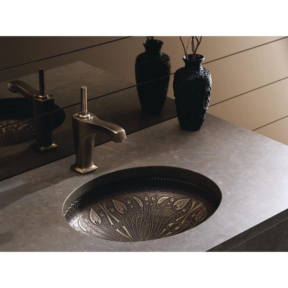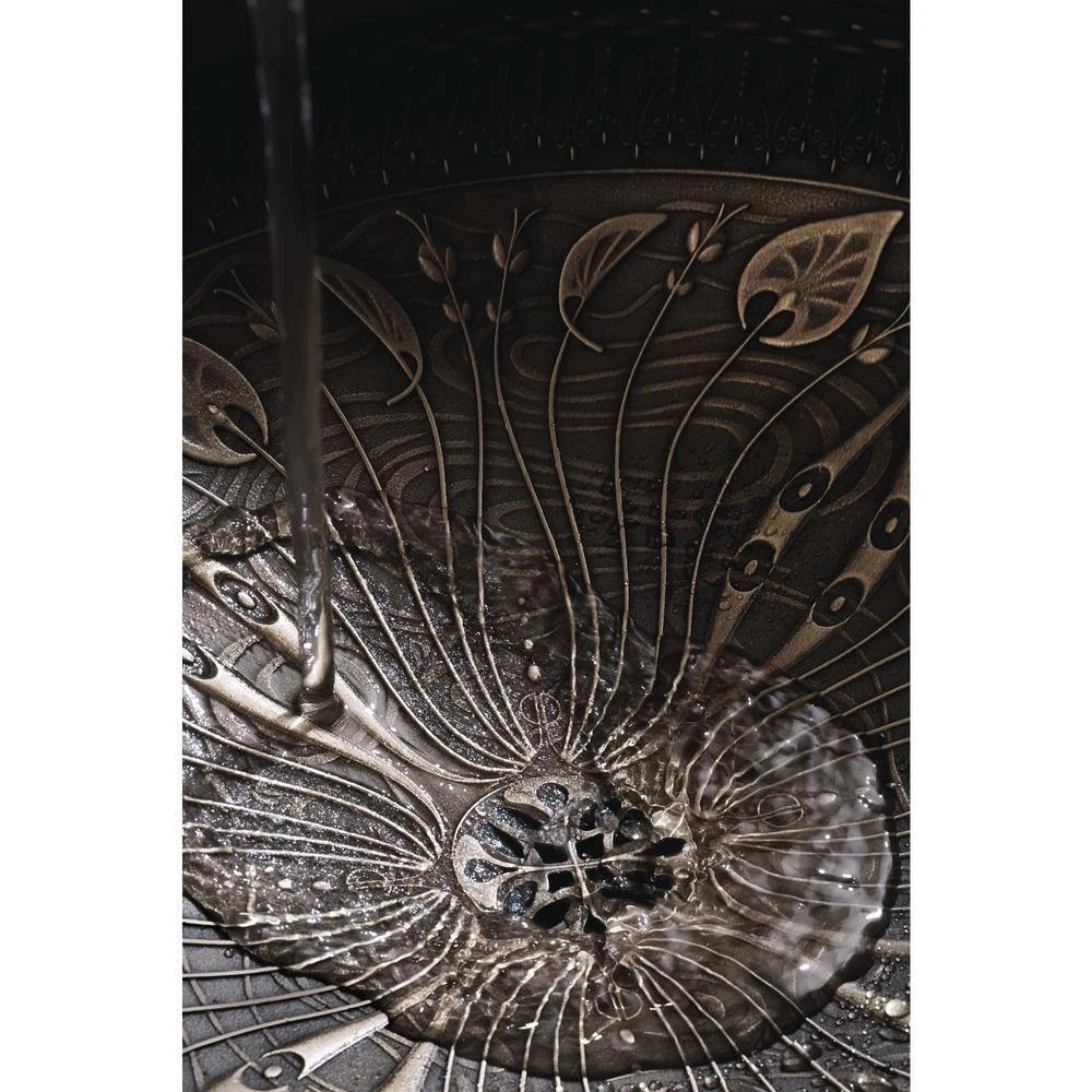 Lilies Lore is derived from the rich and highly stylized plant motifs of Art Nouveau. Breathing new life into an old-world material, this cast-bronze sink takes on a modern shape through an organic and intricate floral pattern. The grid drain is built into the basin surface, offering a seamless bowl with a continuous pattern. Over time, the patina will deepen to a warm brown finish to reflect the movement of water.