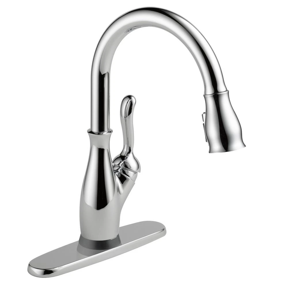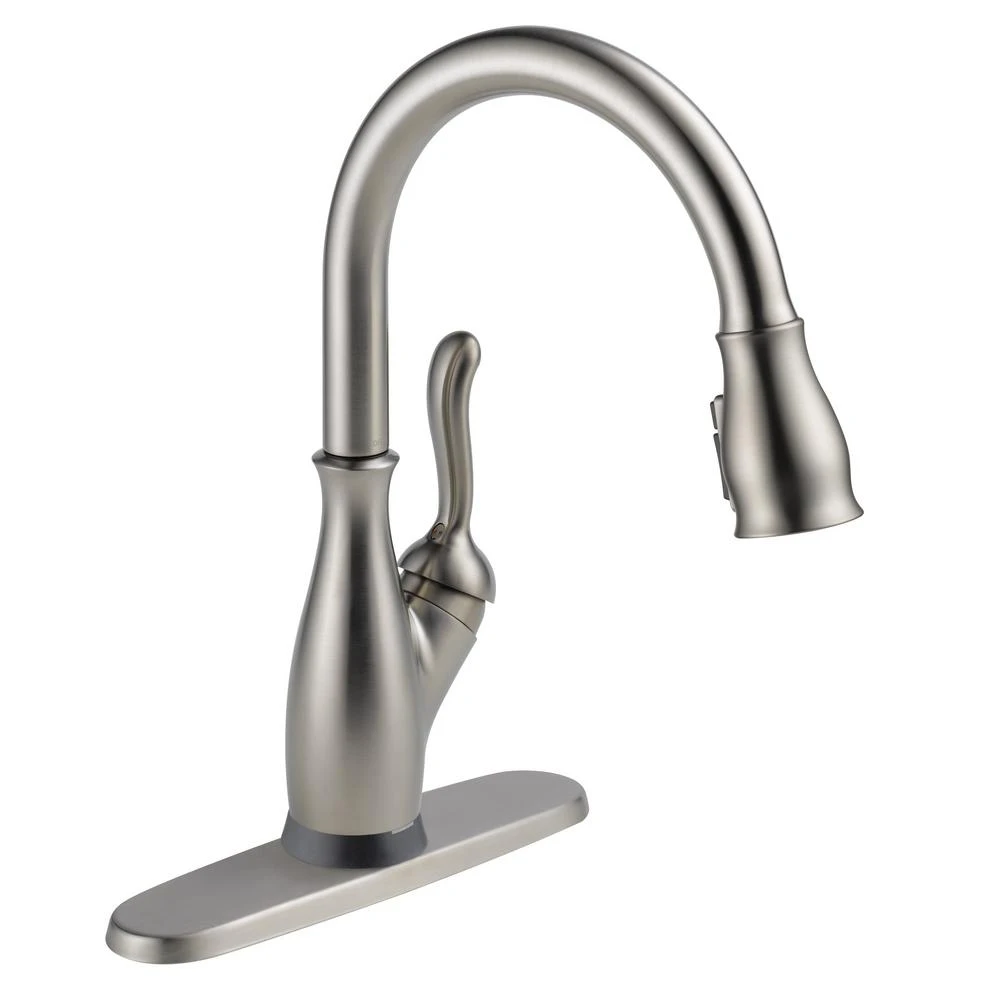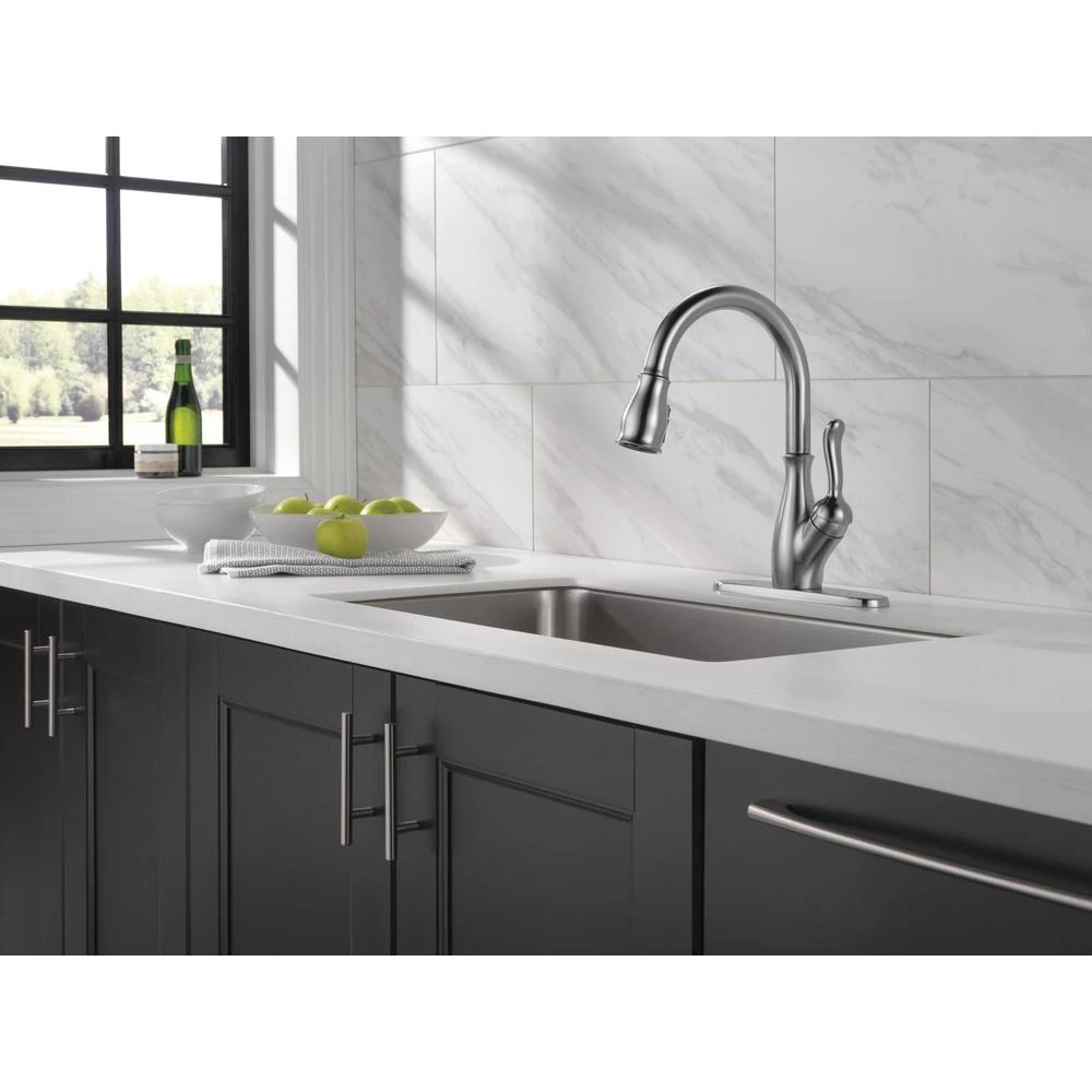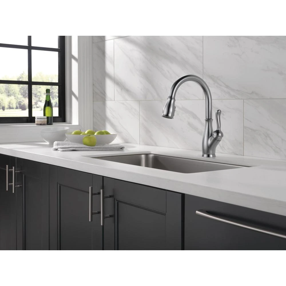 Delta MagnaTite Docking uses a powerful integrated magnet to pull your faucet spray wand precisely into place and hold it there so it stays docked when not in use. Delta ShieldSpray Technology cleans with laser-like precision while containing mess and splatter. A concentrated jet powers away stubborn messes while an innovative shield of water contains splatter and clears off the mess, so you can spend less time soaking, scrubbing and shirt swapping. Delta faucets with DIAMOND Seal Technology perform like new for life with a patented design which reduces leak points, is less hassle to install and lasts twice if the industry standard. Kitchen faucets with Touch-Clean Spray Holes allow you to easily wipe away calcium and lime build-up with the touch of a finger. You can install with confidence, knowing that Delta faucets are backed by our Lifetime Limited Warranty. Industry standard is based on ASME A112.18.1 of 500,000 cycles.