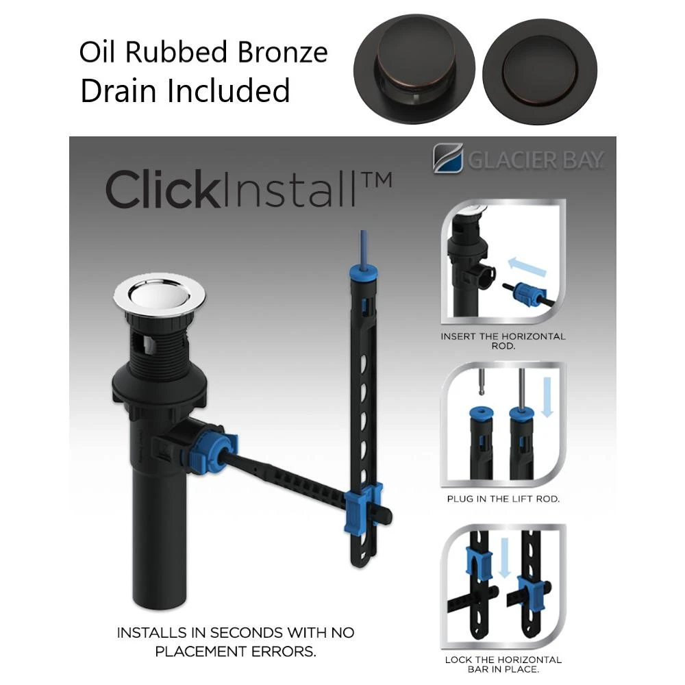 - Coordinating replacement Glacier Bay Drain Assemblies available in Bronze: (Universal ClickInstall Drain Assembly in Bronze), (Drain Assembly in Bronze)