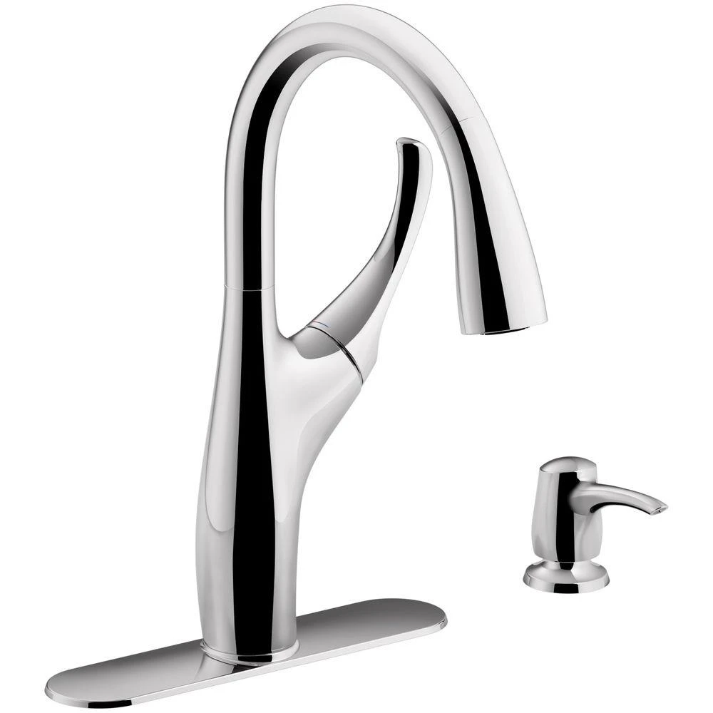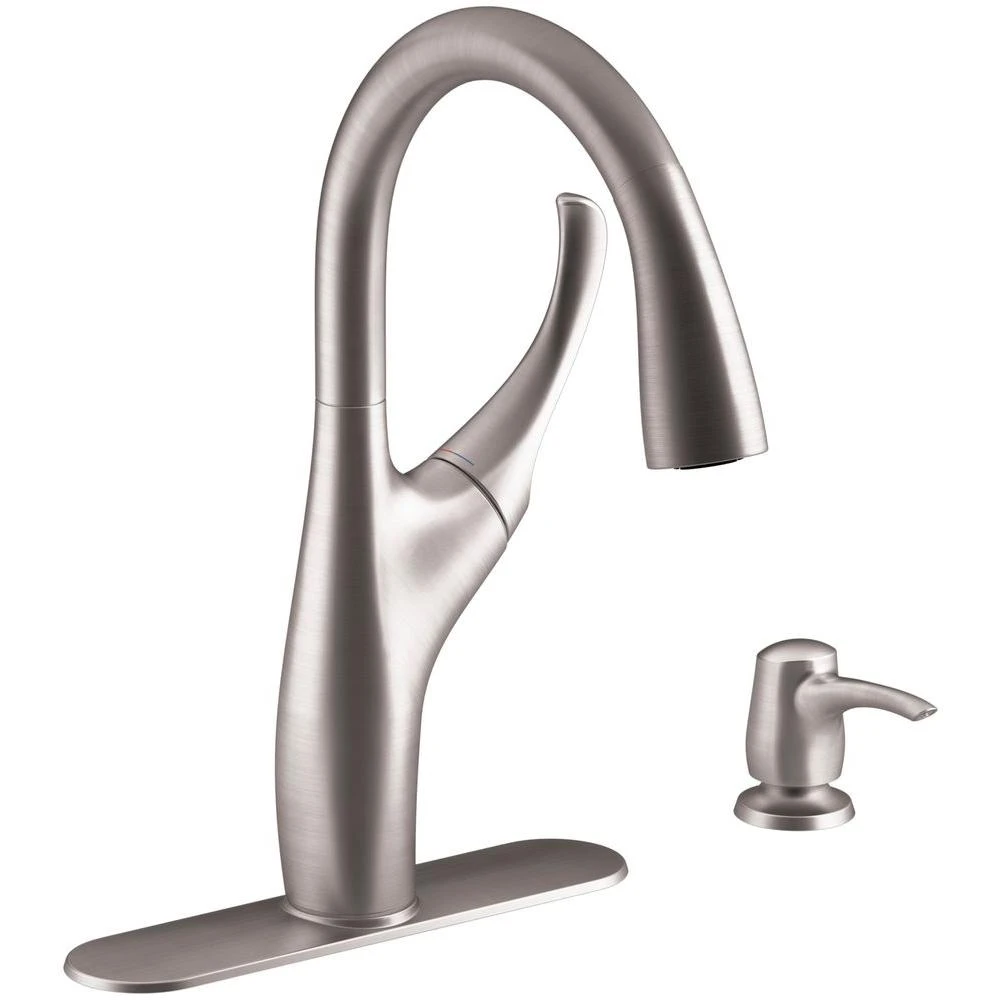 With a high-arch spout and smooth lines, the Mazz pull-down kitchen faucet makes a striking design statement with its elegant, graceful form. The unique joystick valve offers a hint of luxury with smooth, full rotation for effortless temperature and volume control. Mazz includes a coordinating soap/lotion dispenser.