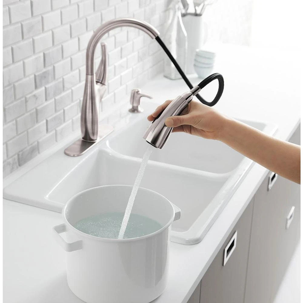 - ProMotion technology’s light, quiet nylon hose and ball joint make the pull-down spray head easier and more comfortable to use