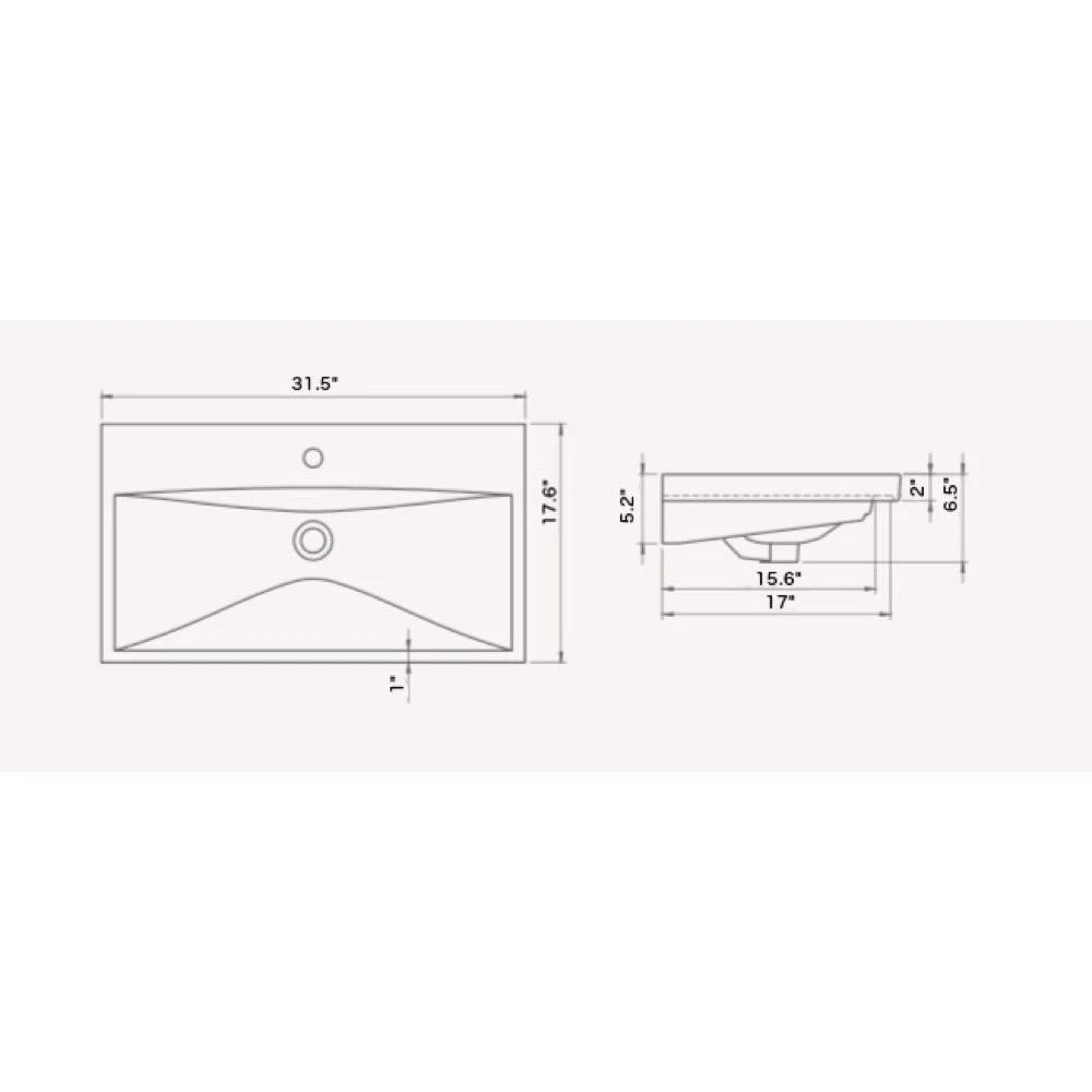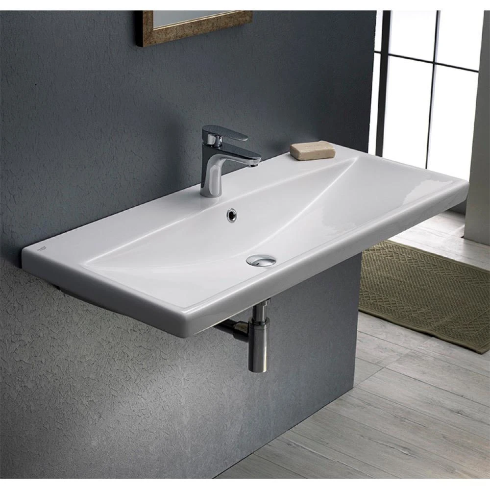 Rectangle white bathroom sink made from high quality ceramic. Contemporary style sink with wall mounted or self-rimming mounting. Sink has 1 pre-drilled faucet hole. Part of the CeraStyle Elite collection. Made in Turkey.