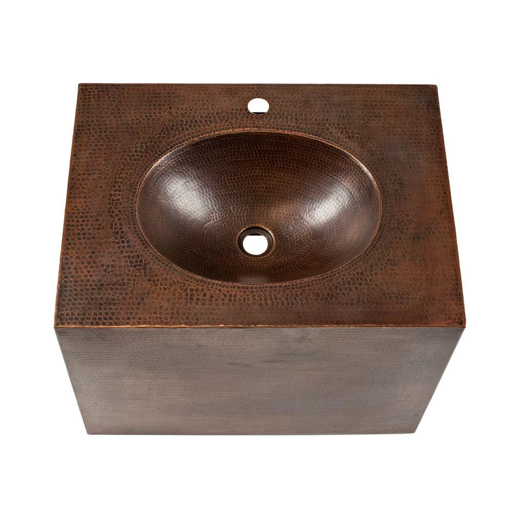 Premier Copper Products introduces our new hand hammered copper wall mount vanities with the sink built into the vanity. This simple style vanity is perfect for smaller bathrooms and powder rooms. Copper’s antibacterial and antimicrobial properties allow this vanity to be easily cared for – never having to use harsh chemicals that are harmful to people and the environment. Endlessly recyclable, this vanity will never take up space in a landfill like other stone and porcelain products. It will not only be an eye catching art piece in your bathroom, but it will be an eco-friendly product that will endure for generations.