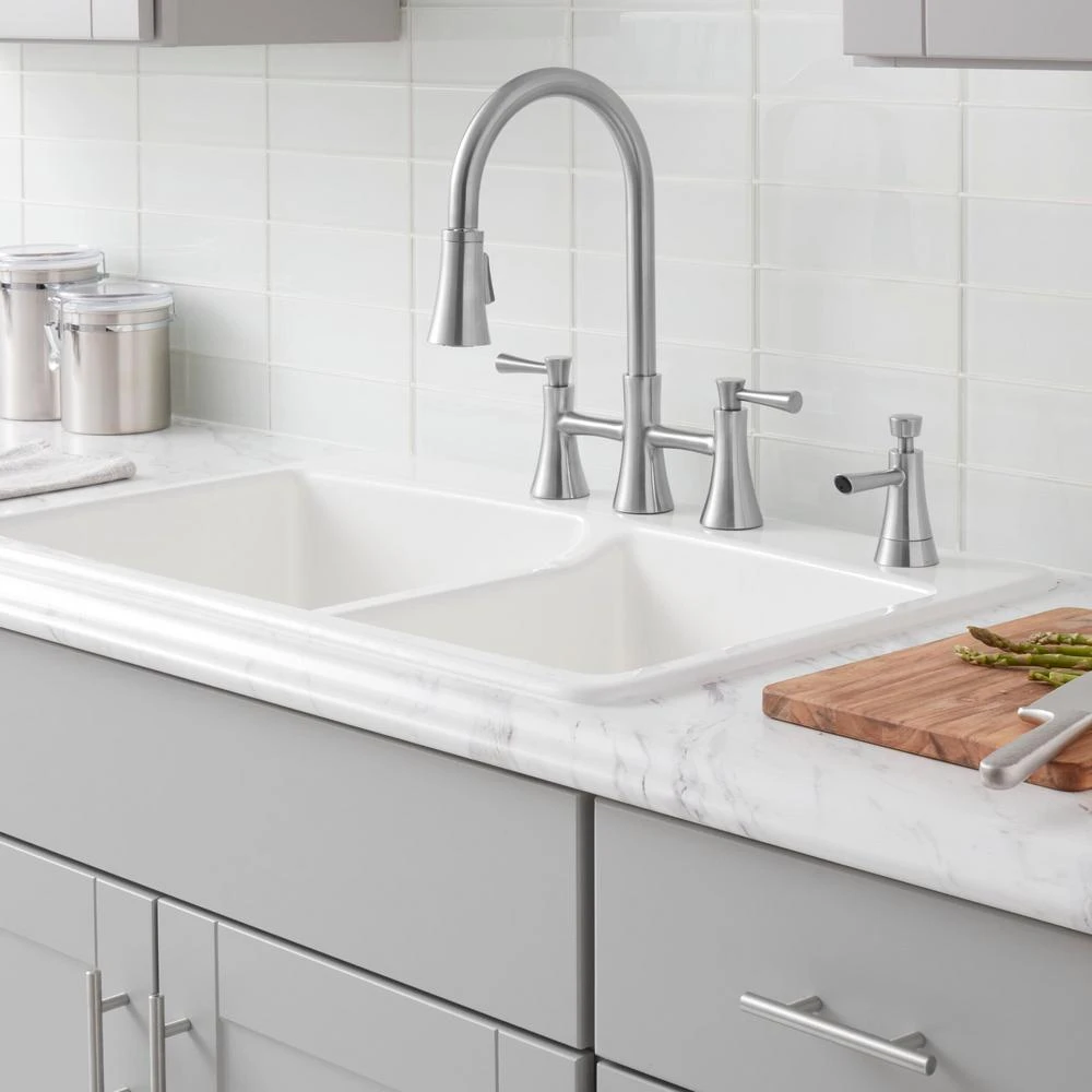 Glacier Bay Selma 2-Handle Pull-Down Sprayer Bridge Kitchen Faucet with Soap Dispenser in Stainless Steel features ceramic disc valves for drip-free performance. It is easy to install and durably constructed for years of use. The concenient pull down spray makes washing dishes quick and easy. A limited lifetime warranty is included.