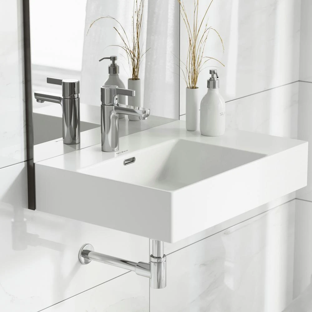 The St. Tropez wall hung sink can accompany any bathroom setting. With a resolute and vivid design the wall hung sink makes a bold statement. It comes equipped with a raised surface to provide additional space for decor or important items.