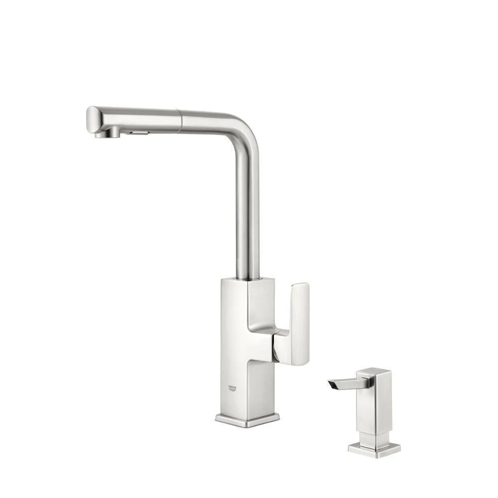 The GROHE Tallinn Pull-Out with Soap Dispenser in Chrome will turn heads with its sleek profile and bold, angular good looks. European designed and German engineered, the kitchen faucet features a side lever handle equipped with a GROHE SilkMove cartridge for easy maneuvering and precise water temperature and volume control, as well as a swivel spout that rotates 360° for maximum accessibility. The dual-function pull-out spray head has GROHE SpeedClean spray nozzles, which protect against lime scale buildup and easily transitions between streams and spray functions with a push of a button. Offered in brilliant GROHE StarLight Chrome, the faucet is dirt- and scratch-resistant, making maintenance a breeze and will look good as new even after a lifetime of use.