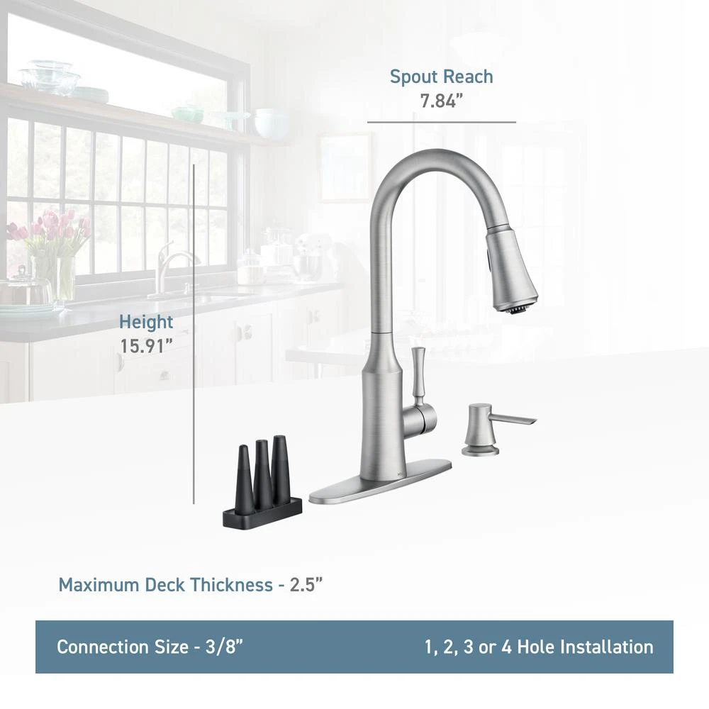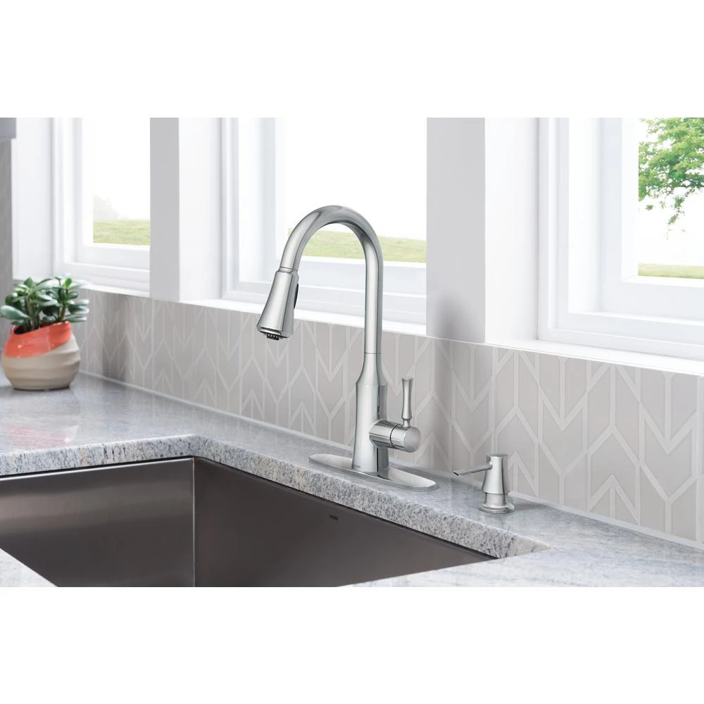 The timeless yet fashion-forward design of the Venango pulldown kitchen faucet offers a flexible, detailed look that is complementary to a variety of kitchen styles. The fixture features MOEN’s Power Clean spray technology, which cleans 50% faster than MOEN faucets without the technology, and includes 3 additional Power Clean attachments to provide multiple, focused spray options for hard-to-clean items. It also comes equipped with MOEN’s Reflex system to ensure smooth operation and secure docking of the spray wand, as well as a matching soap dispenser for a coordinated appearance.