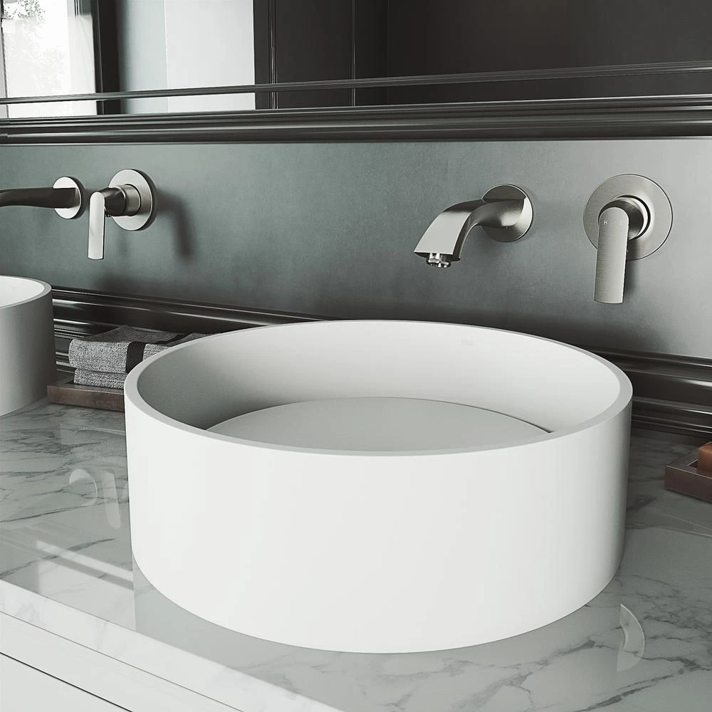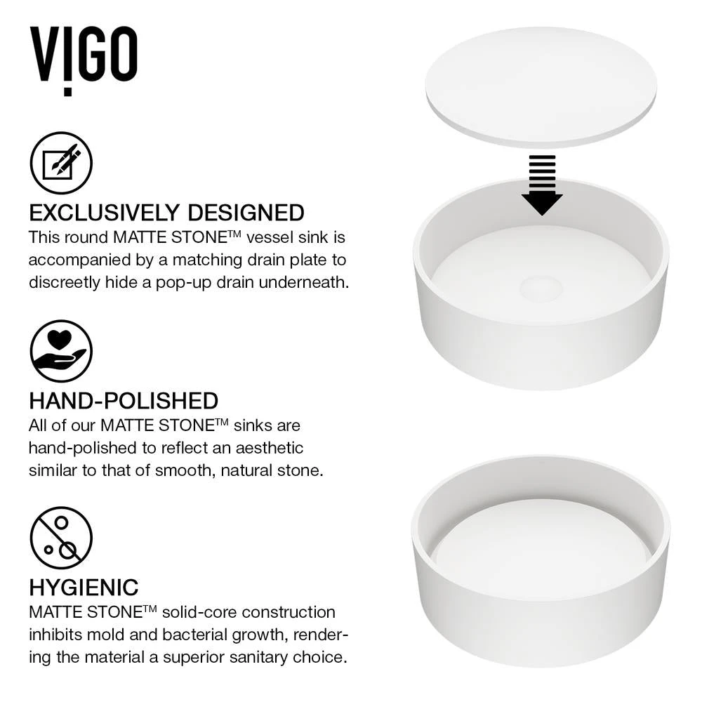 Make a statement with the VIGO Anvil Matte Stone Vessel Bathroom Sink. Made from solid core composite this hand-polished sink provides unparalleled strength and resistance to impact. VIGO’s proprietary Matte Stone sinks are scratch and fade resistant to make upkeep easy. The Anvil’s cylindrical shape and elevated interior plate offer a unique interpretation of the modern bathroom sink. With water cascading off its sides, the interior plate mimics an infinity pool. High-end in both quality and design, the VIGO Anvil will immediately update any bathroom.