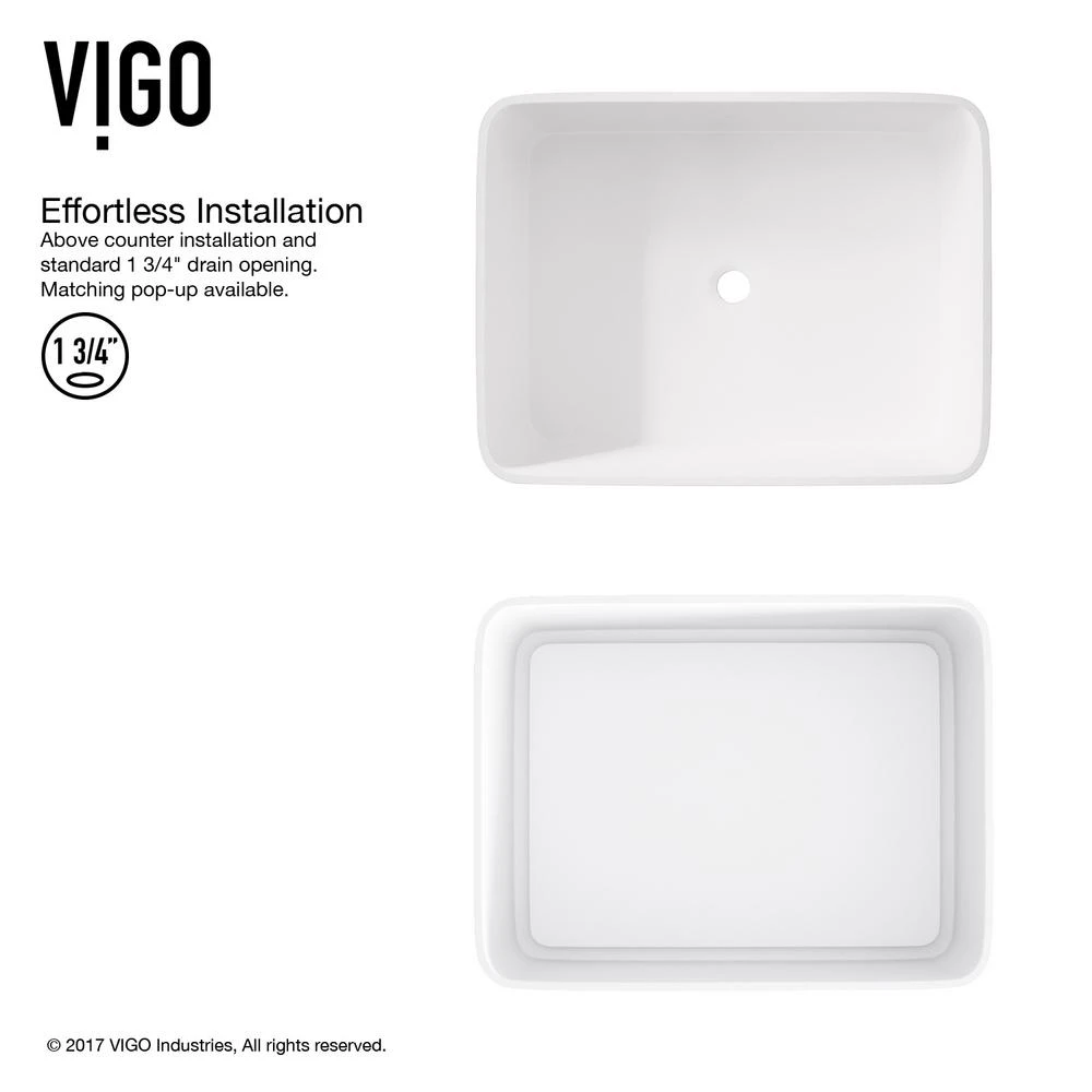 Seamless, solid core Matte StoneTM construction makes the VIGO Jasmine Matte StoneTM Vessel Bathroom Sink extremely durable. Its surface is scratch and fade resistant, and is easy to keep clean and maintain. With its rectangular design and satin-smooth matte surface, this vessel sink features a unique drain cover plate, creating a waterfall effect. This plate also discreetly hides the pop-up drain beneath it to complete a clean, elegant overall design.